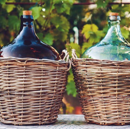 Скляні бутлі для солінь і виноробства мають відмінності – це ширина горлечка. Бутлі для виноробства оснащені вузькою шийкою, на які легко встановлюється водяний затвор. Вони бувають зелені, коричневі або прозорі. Їх використовують для виготовлення вина, коньяку та інших напоїв. Для зручності використання та декору їх часто розміщують усередині плетених кошиків, які також захищають тендітне скло посудин. Їх випускають різних форм і розмірів (від 1 до 54 л.), з ручками і декором. Пляшки в лозі різних форм і розмірів ви також можете купити в нашому магазині – див. розділ Бутлі в лозі (ручна работа).