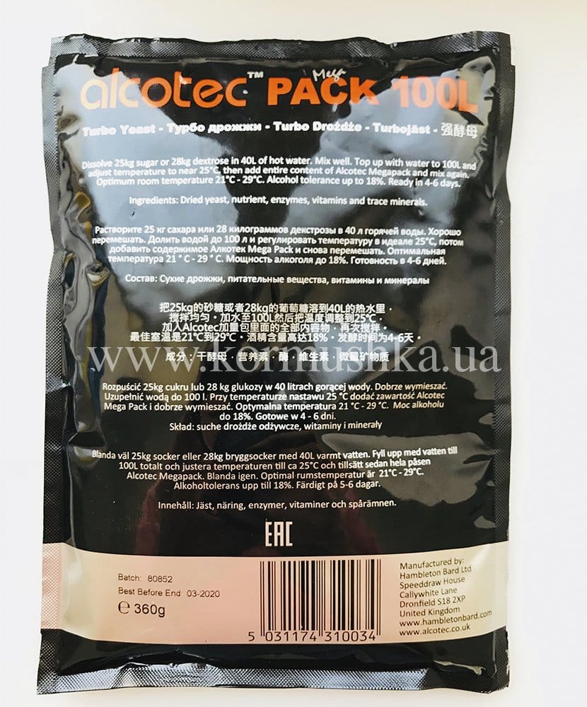 Mega Pack 100 l – призначені для швидкого виробництва горілки. Ідеальна температура бродіння 21-29°С. Пакет 360 г розрахований на 25 кг цукру та 75 літрів води. Час зброджування 4-6 днів. В результаті одержуємо брагу з 18% вмістом алкоголю. Термін придатності 2-х років від дати виробництва.