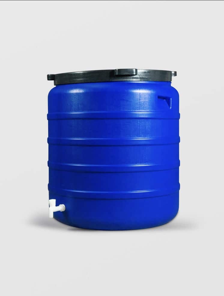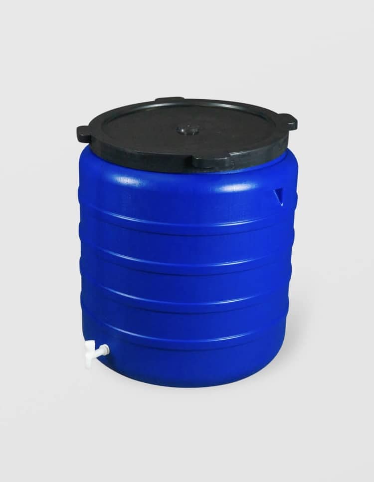 Бочка виготовлена із харчового пластику. Висота 89 см, ширина 74 см, діаметр вхідного отвору 63 см. Колір синій. Зроблено у Румунії.