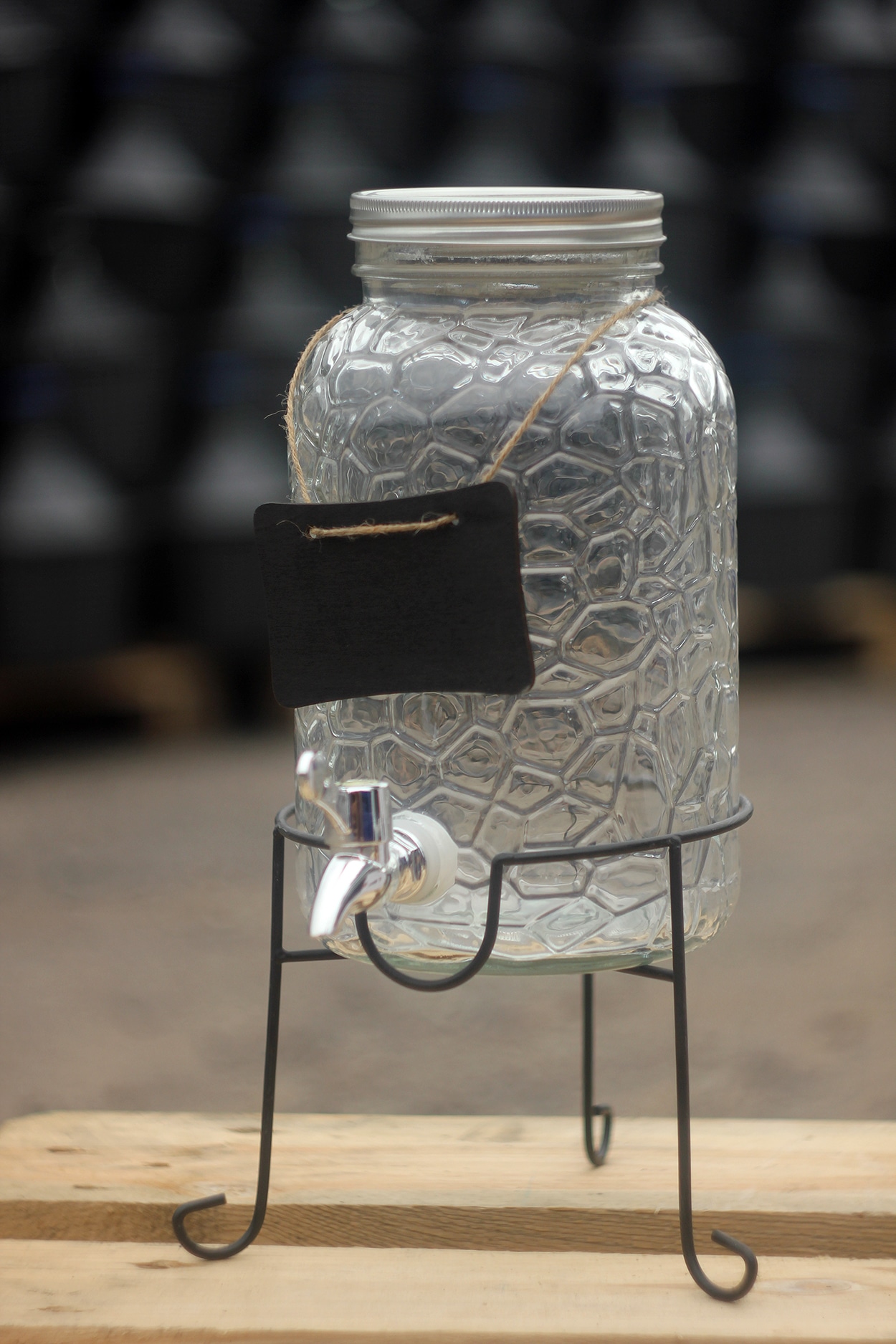 Скляна банка з широким горлом та краном. Ідеально підходить для лимонаду, соку, води, вина. Оснащена бугельною кришкою, ручкою для перенесення банки, металевою підставкою.