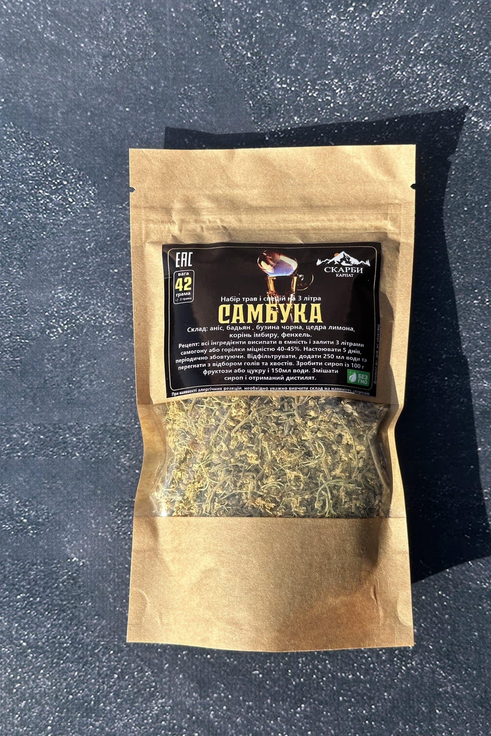 Склад: цедра лимона, аніс, бадьян, квіти бузини, корінь Имбер, фенхель