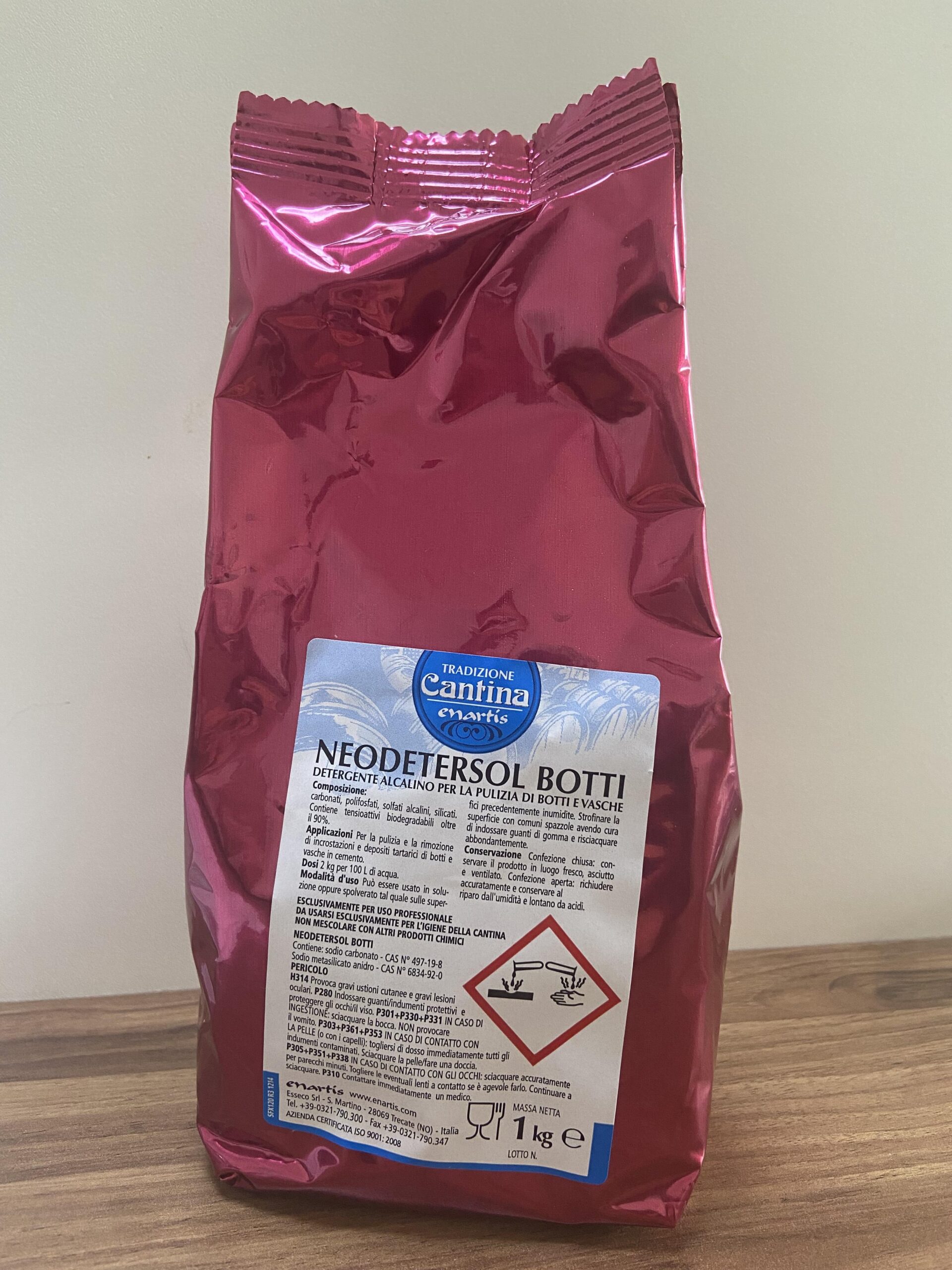 Зовнішній вигляд: однорідний білий порошок без запаху, антикальцій, легко розчиняється в гарячій або холодній воді. NEODETERSOL VETRO є концентрованим продуктом з великою кількістю переваг у порівнянні з іншими рідкими або порошковими миючими засобами. Завдяки синергетичній дії своїх комплексних солей, продукт ефективно видаляє всю гаму та осад як усередині, так і зовні пляшки, залишаючи їх чистими та блискучими. Продукт містить багато активних речовин і є дуже економічним, оскільки дуже ефективний при дуже низьких концентраціях. Не містить кислоти або хлору. При нормальних концентраціях продукт нешкідливий для шкіри та не зашкодить загальним виноробним матеріалам.