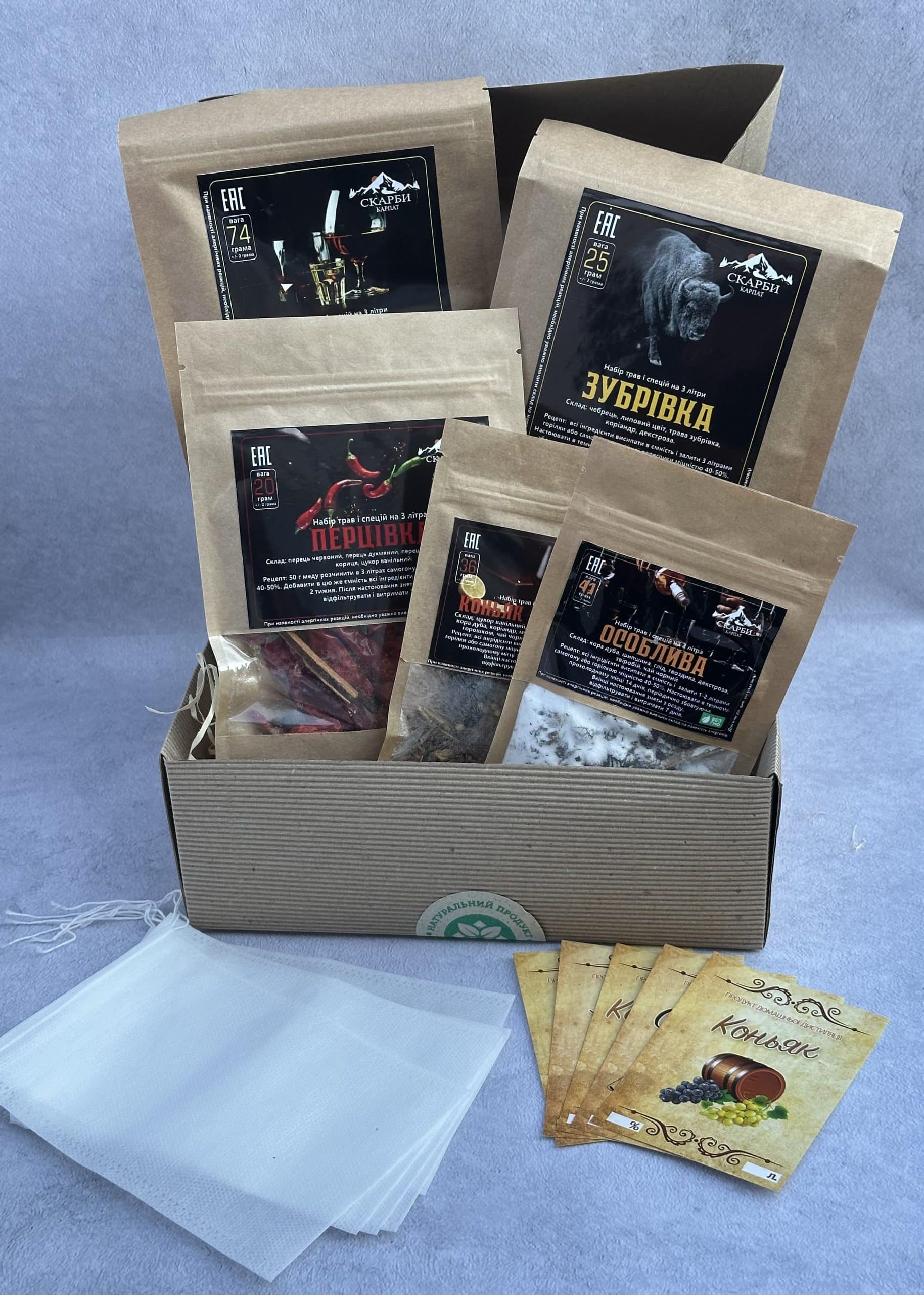 Комплект: коробка, наповнювач, крафтова наклейка, 5 етикеток на пляшки, 5 мішечків для трав.