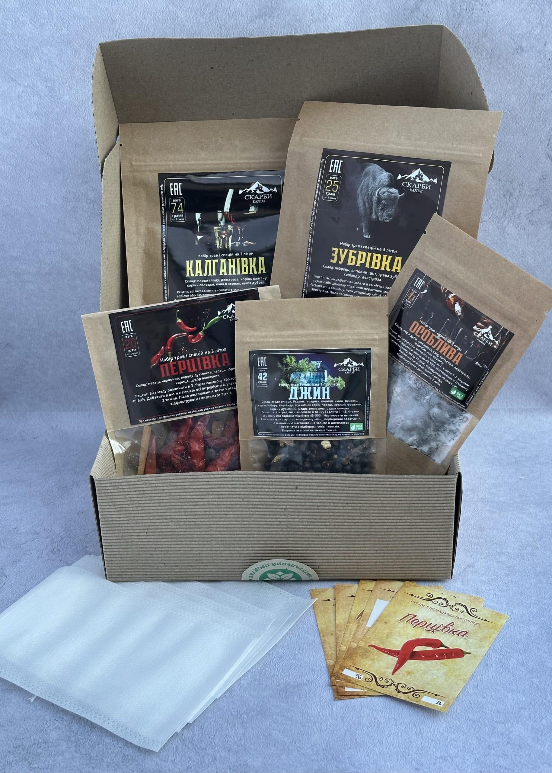 Комплект: коробка, наповнювач, крафтова наклейка, 5 етикеток на пляшки, 5 мішечків для трав.