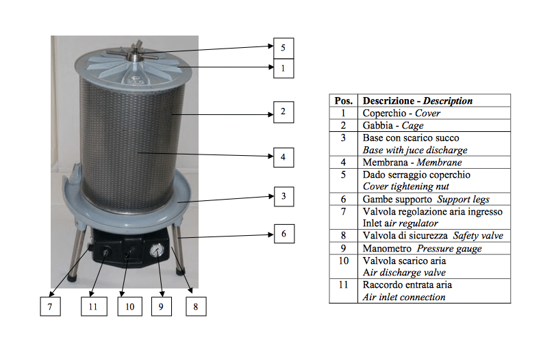 Пневматичний прес оснащений мембраною, в яку подається повітря. Мембрана розширюється, тим самим видавлюючи сік із ягід чи іншої сировини через перфорацію. Рідина витікає, а макуха залишається на стінках кошика. Висока продуктивність заощадить Ваш час та сировину. Усі матеріали, що стосуються продуктів харчування, відповідають сучасним європейським стандартам якості. Пристрій тиску обладнаний запобіжним клапаном. Це робить апарат безпечним для використання. Підведення повітря здійснюється шляхом підключення компресора. Прес виконаний із високоякісної нержавіючої сталі. Він дуже міцний, тож прослужить довгі роки. Апарат легко мити та очищати від макухи. Пневматичний прес простий та зручний у використанні. Зроблено в Італії.