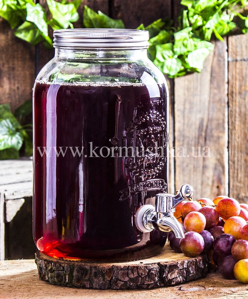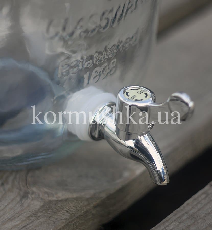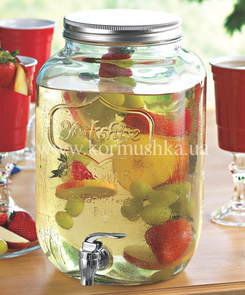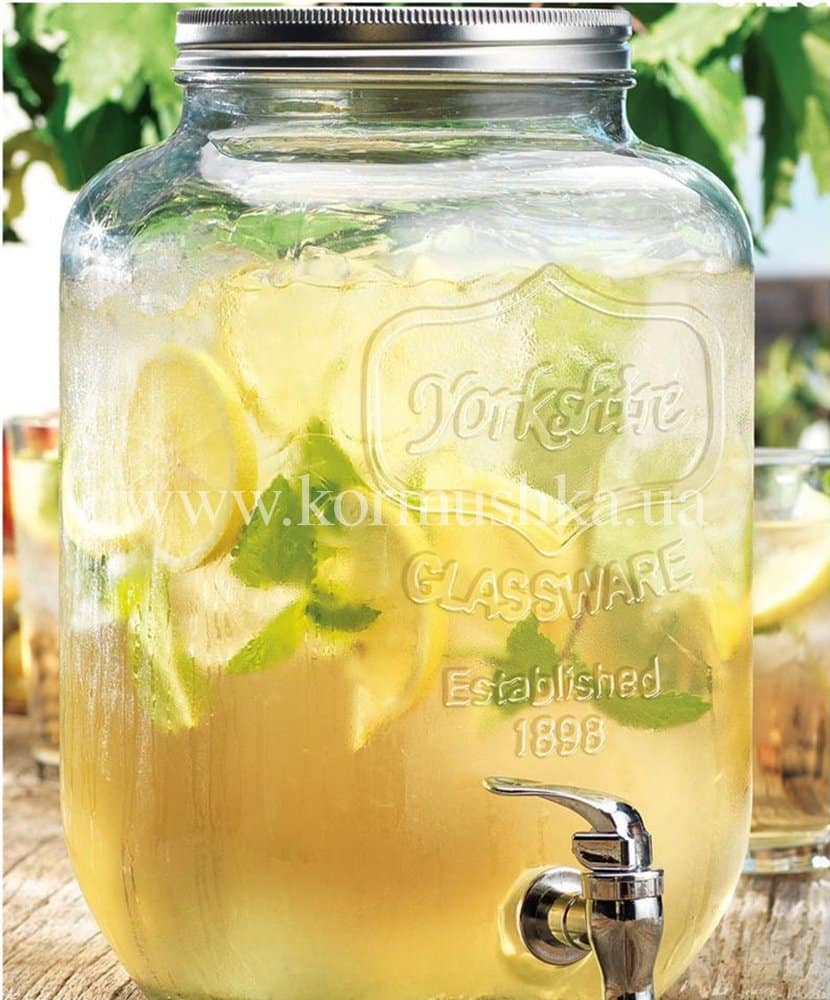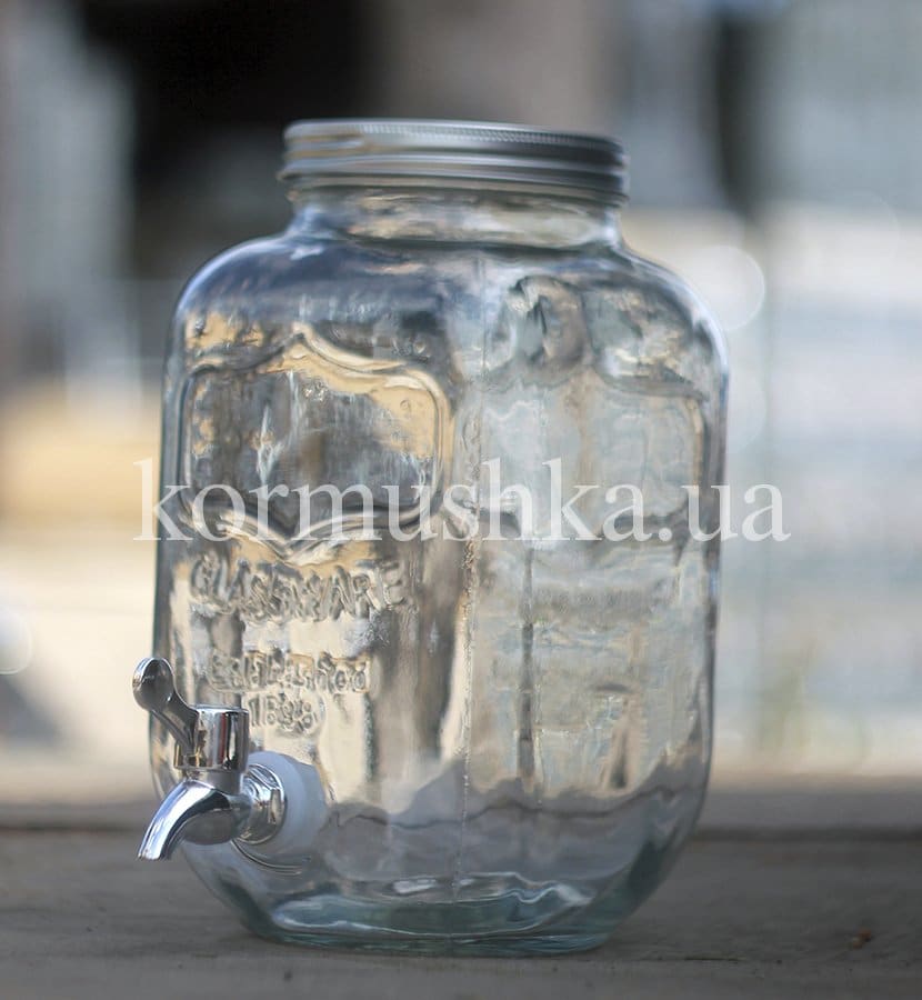 Стеклянная банка с широким горлом и краном. Идеально подходит для лимонада, сока, воды, вина. Оснащена резьбовой крышкой.