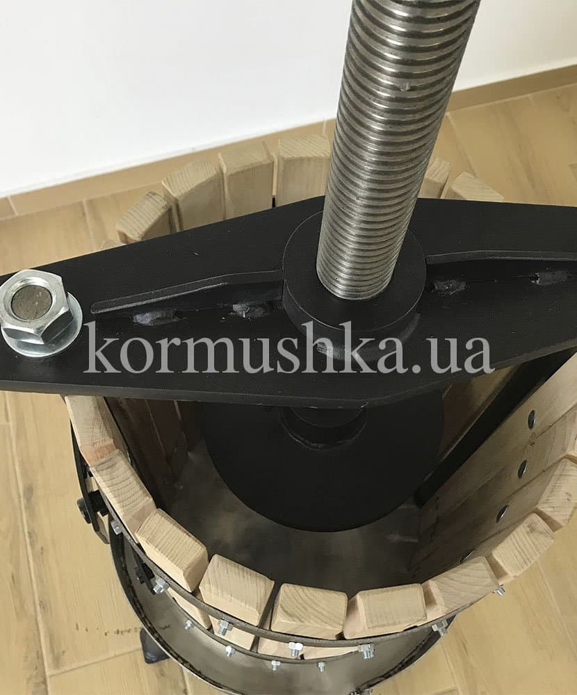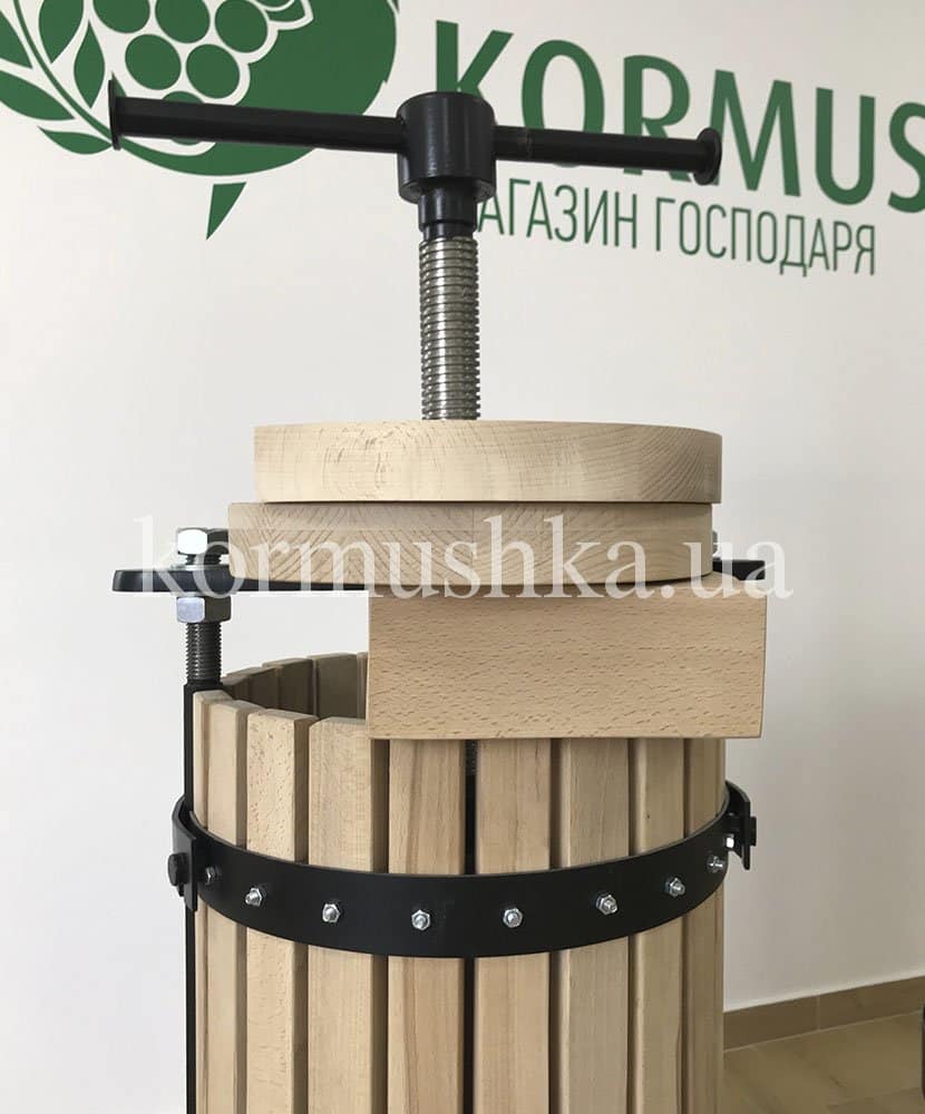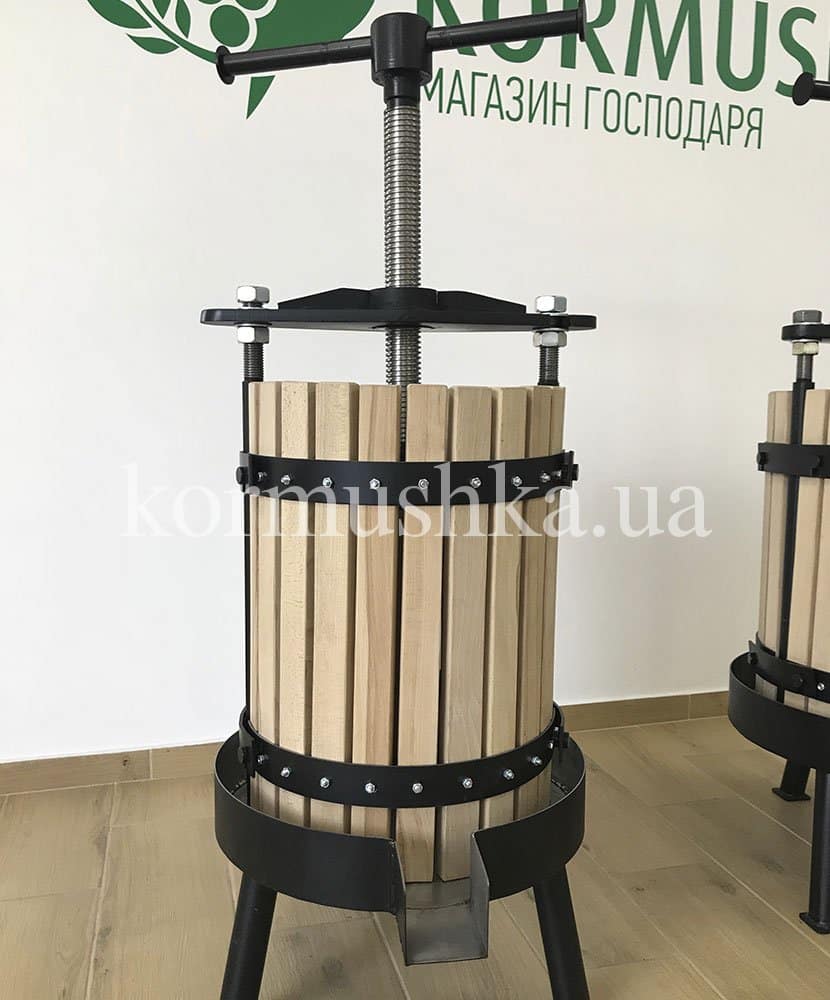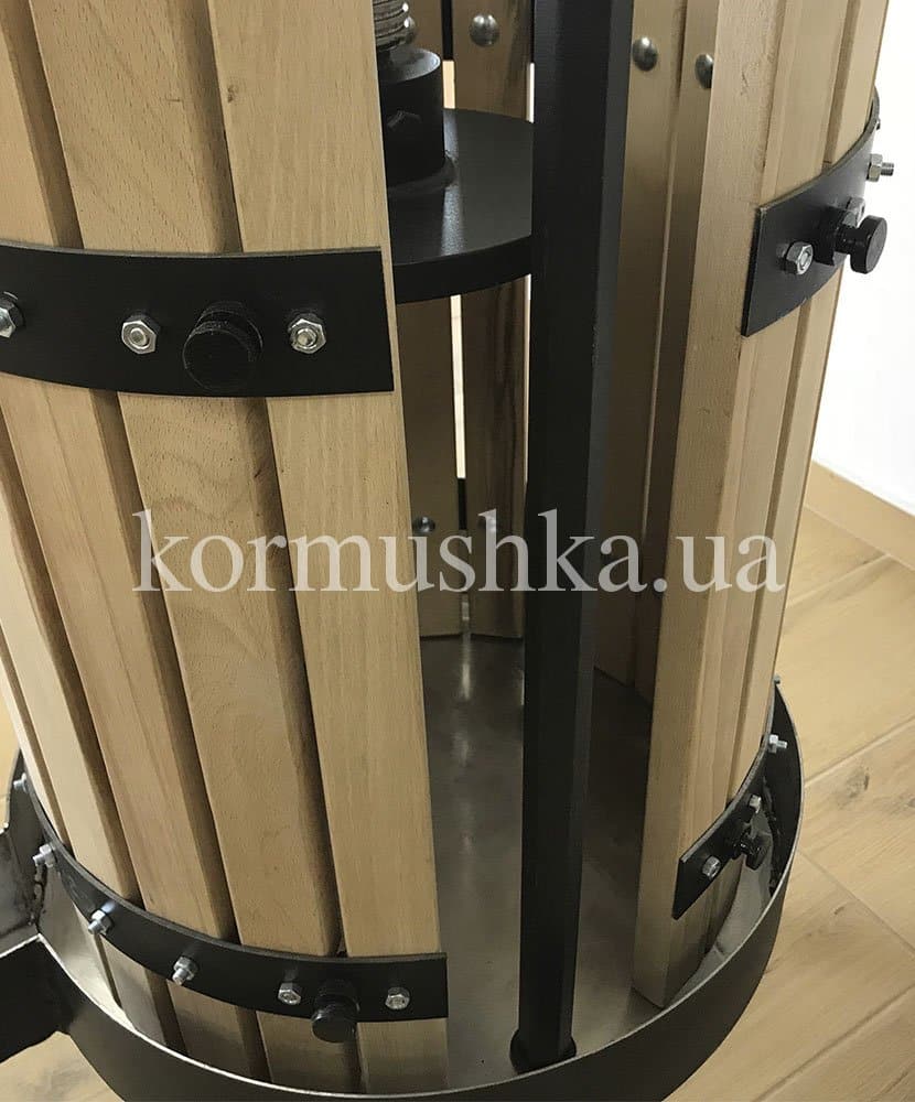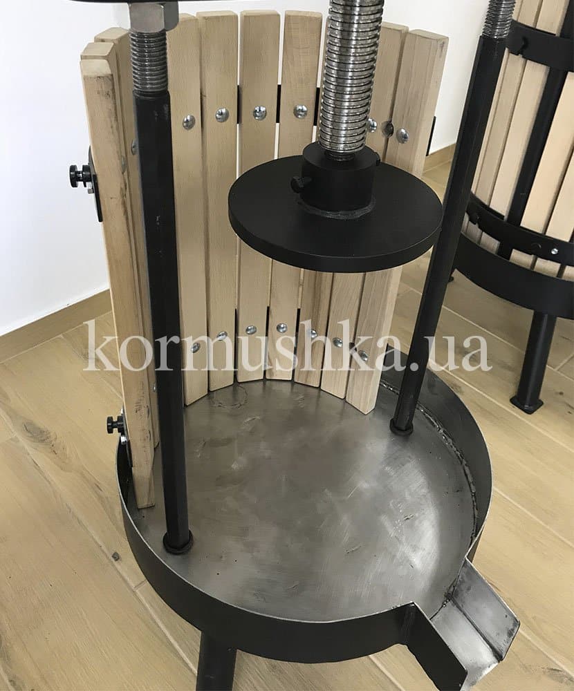 Комплектация пресса: литый стальной корпус, дубовая корзина, поддон на ножках, винт, стальная рукоятка, дубовая прижимная тарелка и дубовые подставки на тарелку. Корзину можно открыть, что упрощает и ускоряет процесс. Поддон оборудован сливным желобом для удобства слива сока в тару. Очень качественная, простая, удобная и проверенная временем конструкция – делает пресс образцом среди аналогов. Такой помощник будет служить Вам и Вашей семье долгие годы!