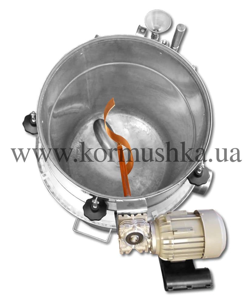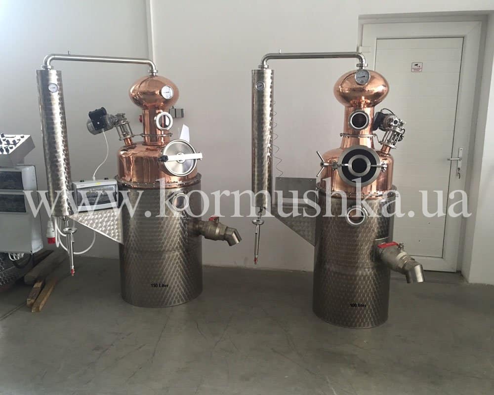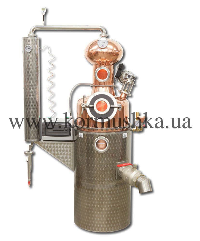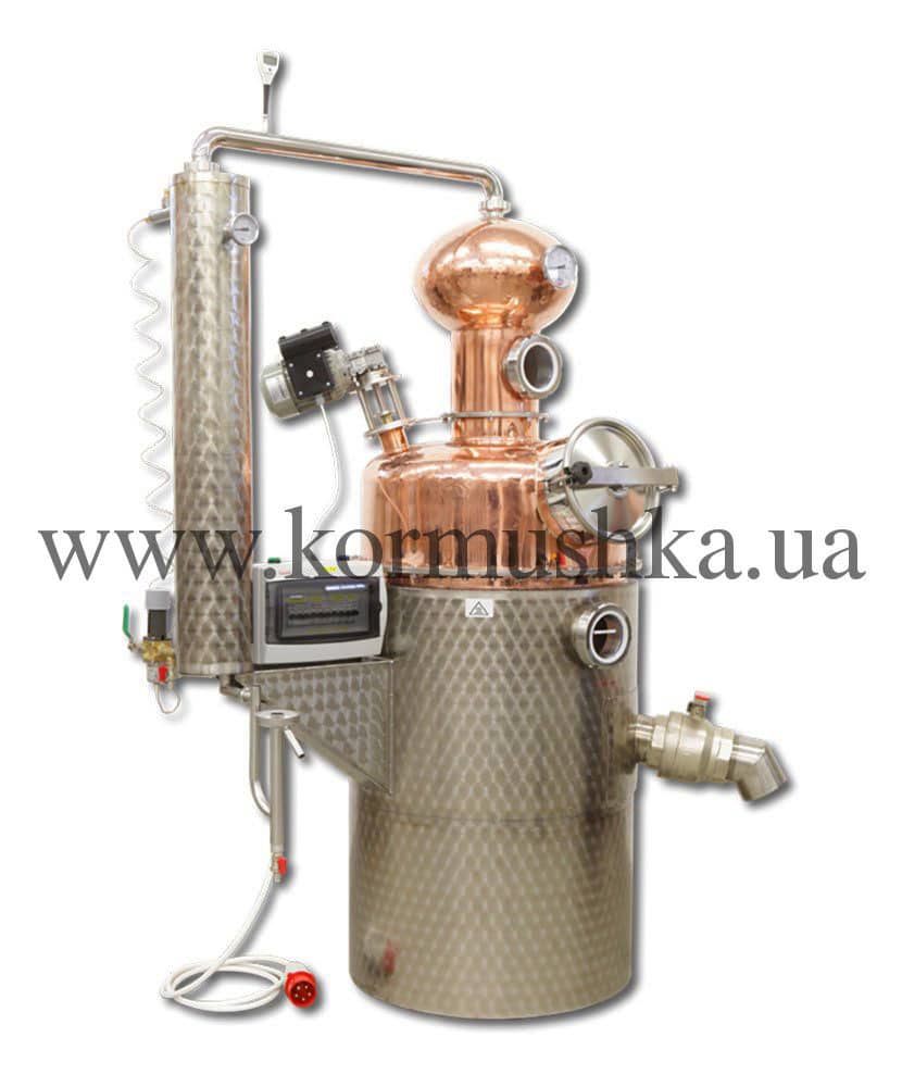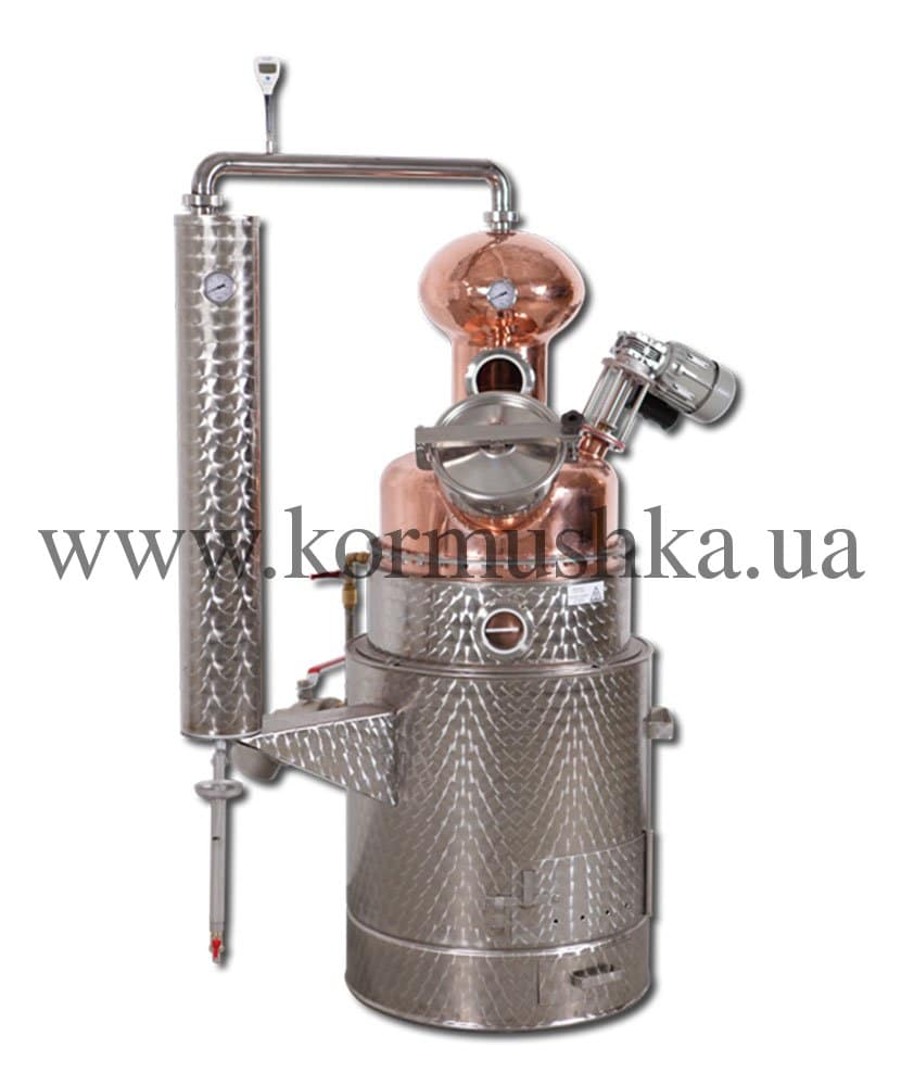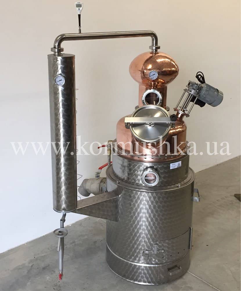 Медный котел изготовлен вручную из пищевой меди толщиной 1,5 мм. Оснащен электрическим мотором для перемешивания браги. Такая опция не позволяет браге пригореть.