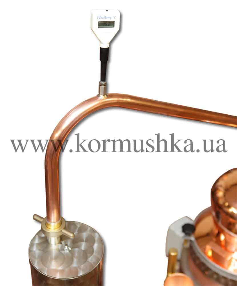 Шапка, или паровой купол исполнена таким образом, чтобы предотвратить попадание тяжелых спиртов в холодильник. В куполе есть большое отверстие для залива браги, в базовой комплектации крышка этого отверстия исполнена с нержавеющей стали (можно заказать фирменную крышку с окошком для обзора и подсветкой + 700 EUR). Также, дополнительно можно приобрести воронку из нержавеющей стали, для залива браги (+ 240 EUR). Термодатчик, который расположен вверху купола используется для контроля температуры спиртовых паров. Как дополнительную опцию, можно установить водяной смыв внутренней части котла от остатков браги после завершения роботы (+ EUR). Такая конструкция изготавливается из меди и намного упрощает процесс ухода за аппаратом, поскольку для того чтобы его помыть, достаточно открыть кран.