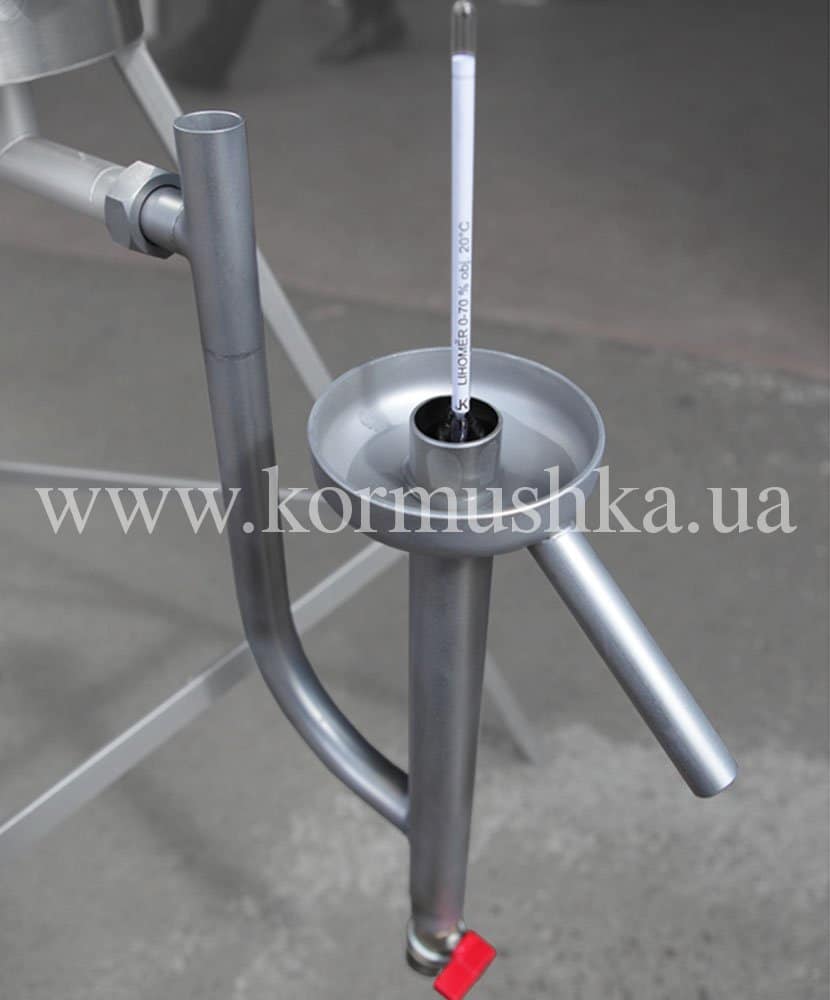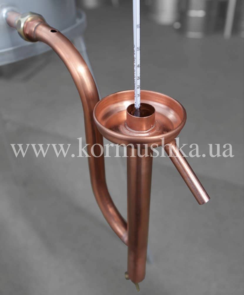 Колба на холодильнике – изготовлена из нержавейки (может быть исполнена из меди + 90 EUR). В колбу вставляется спиртометр, таким образом весь процесс перегонки постоянно контролируется и останавливается по желанию в любой момент. Более того, колба еще служит и как отстойник для тяжелых сивушных масел, которые сливаются через краник в нижней части колбы.